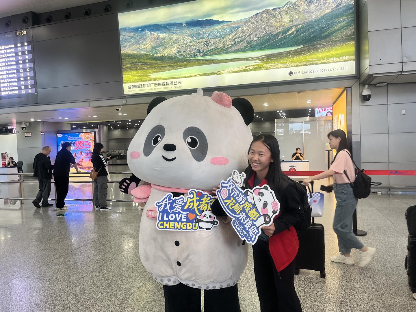 当天,23岁的北京大学学生张雍骏和朋友们抵达成都,可爱的大熊猫人偶一下子吸引了她的注意。“这次主要是来成都参加2025成都赛艇公开赛,等到10月2日比赛结束后,我准备留在成都好好玩几天,这也是我第一次来成都!”张雍骏说,她对此次成都行充满了期待,想去都江堰和青城山,也想品尝美味的红糖糍粑。